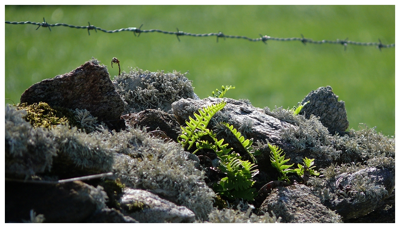le barbelé qui cherche à l'entraver. D'un côté le vert tendre d'une plante toute fragile. De l'autre les pointes acérées